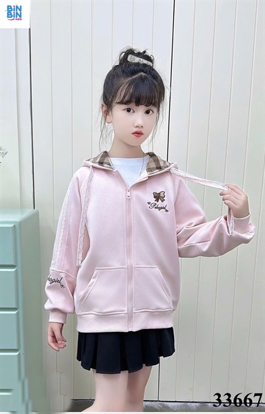 33667- Áo khoác mũ hồng tay ren