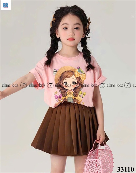 33110-Set váy hồng cô gái 2 bím +cv xếp ly nâu