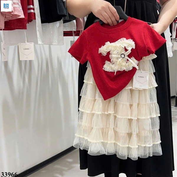 33966- Set Váy Đỏ Nơ Kem Voan Tầng