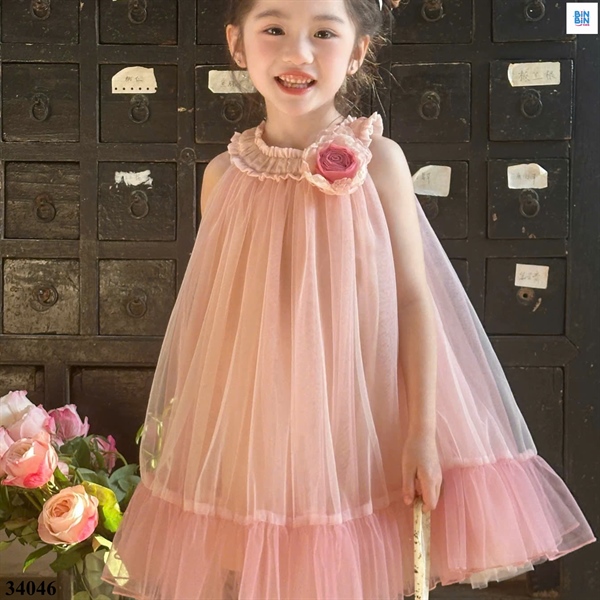 34046-Váy voan hồng cổ bèo trắng