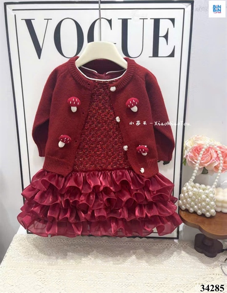 34285- Đầm dạ 2CT đỏ đính nấm